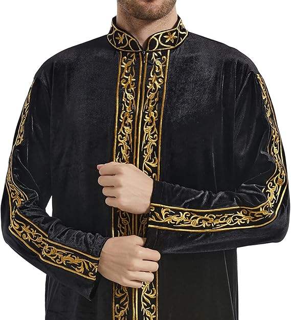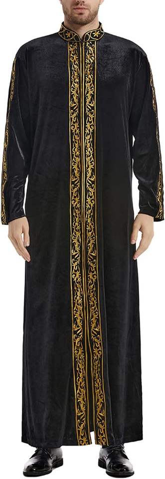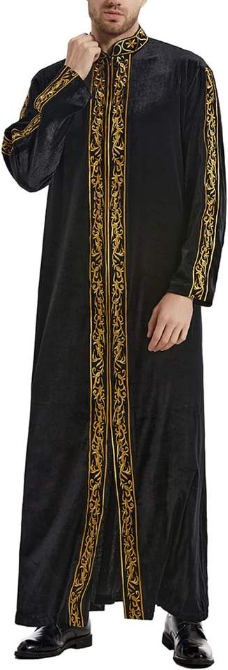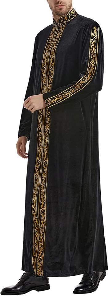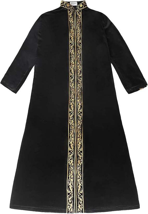 Elegante Thobe de Terciopelo Negro Premium para Hombre, de Color Sólido, con Bordado Dorado – Ropa Tradicional Islámica con Logotipo Personalizado