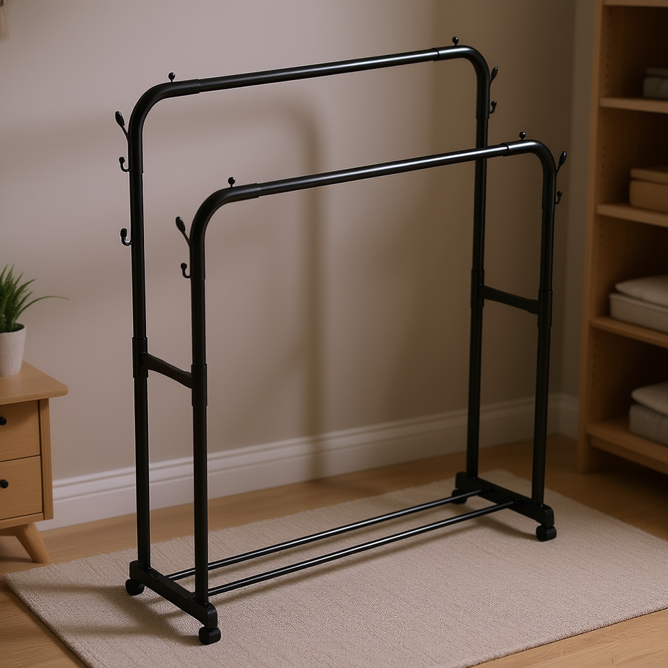 Perchero de ropa Myrva de 2 tubos, de doble nivel, metálico, portátil, diseño minimalista, con estructura de acero al carbono