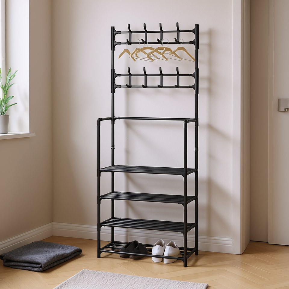 Estante Multiusos 3 en 1 Myrva con Percheros, Organizador Metálico de Entrada de Cinco Niveles, Estilo Minimalista
