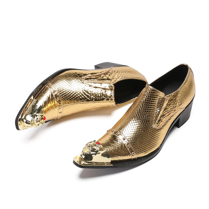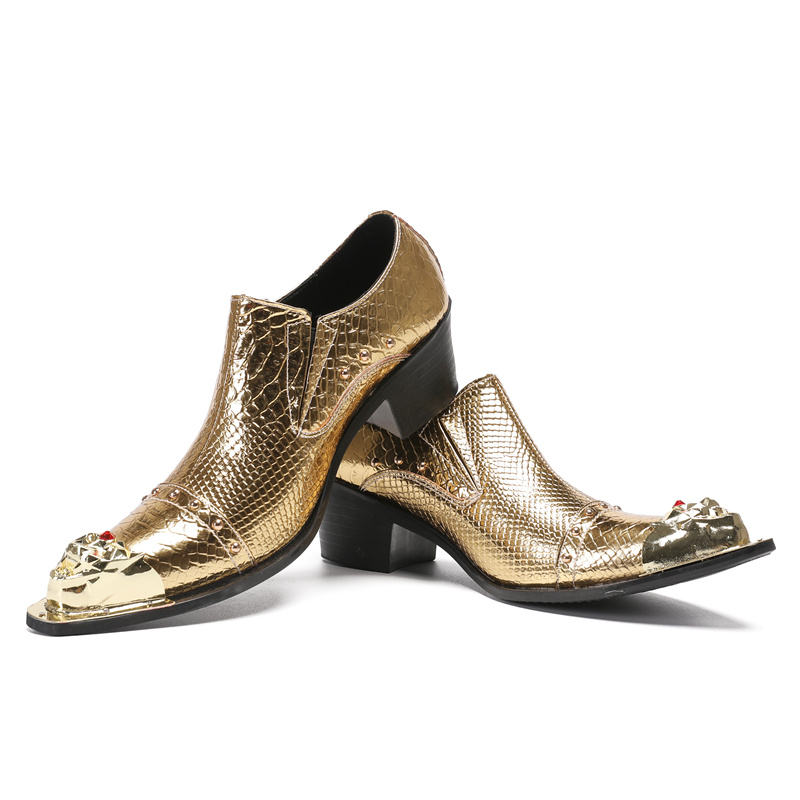 NA546 Metal Point Toe Rivet Zapatos de ocio para hombres Empalme de cuero Tacón grueso Mocasines sin cordones poco profundos Zapatos de vestir de fiesta para hombres