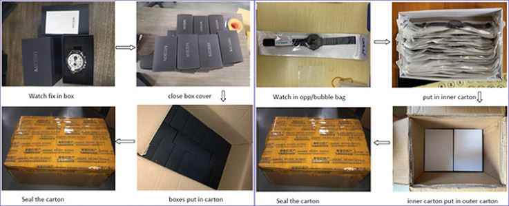 2.Package with box --- the watch fixed in box and put together in carton,50-100pcs/carton, weight aroud 15-20KGS