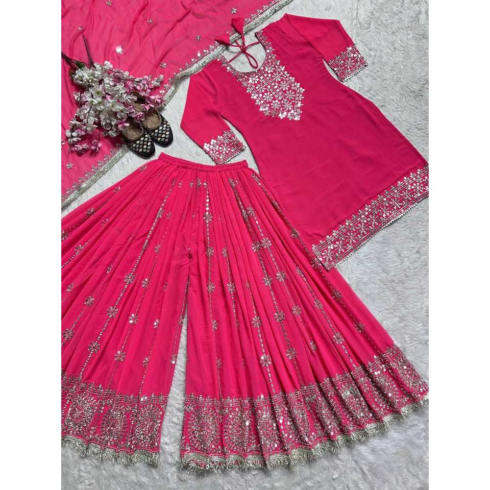 Vestido de Noche Rosa con Bordado Pesado de Diseñador ND, Talla M, para Fiesta, Top-Plazzo y Dupatta