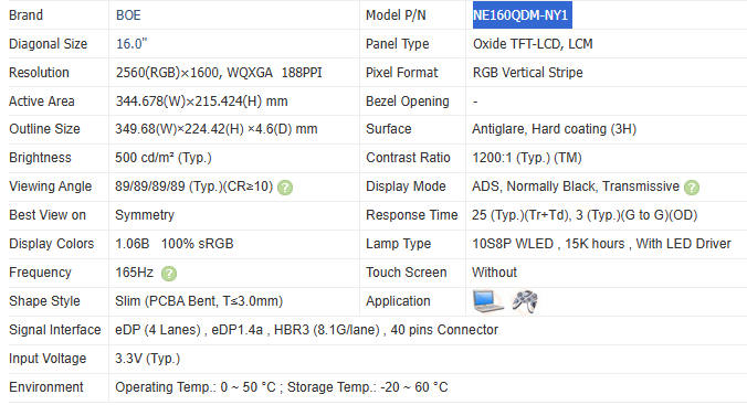 Interfaz:eDP (4 carriles), eDP1.4b, 3.24G/carril, conector de 40 pines