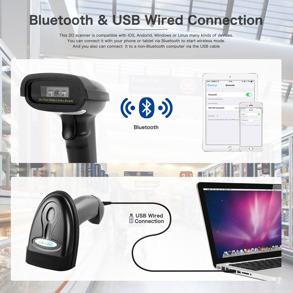 Escáner de Código de Barras NETUM BT, Compatible con Función Inalámbrica 2.4G y Bluetooth y Conexión por Cable, Lector de Código de Barras CCD NT-1228BL