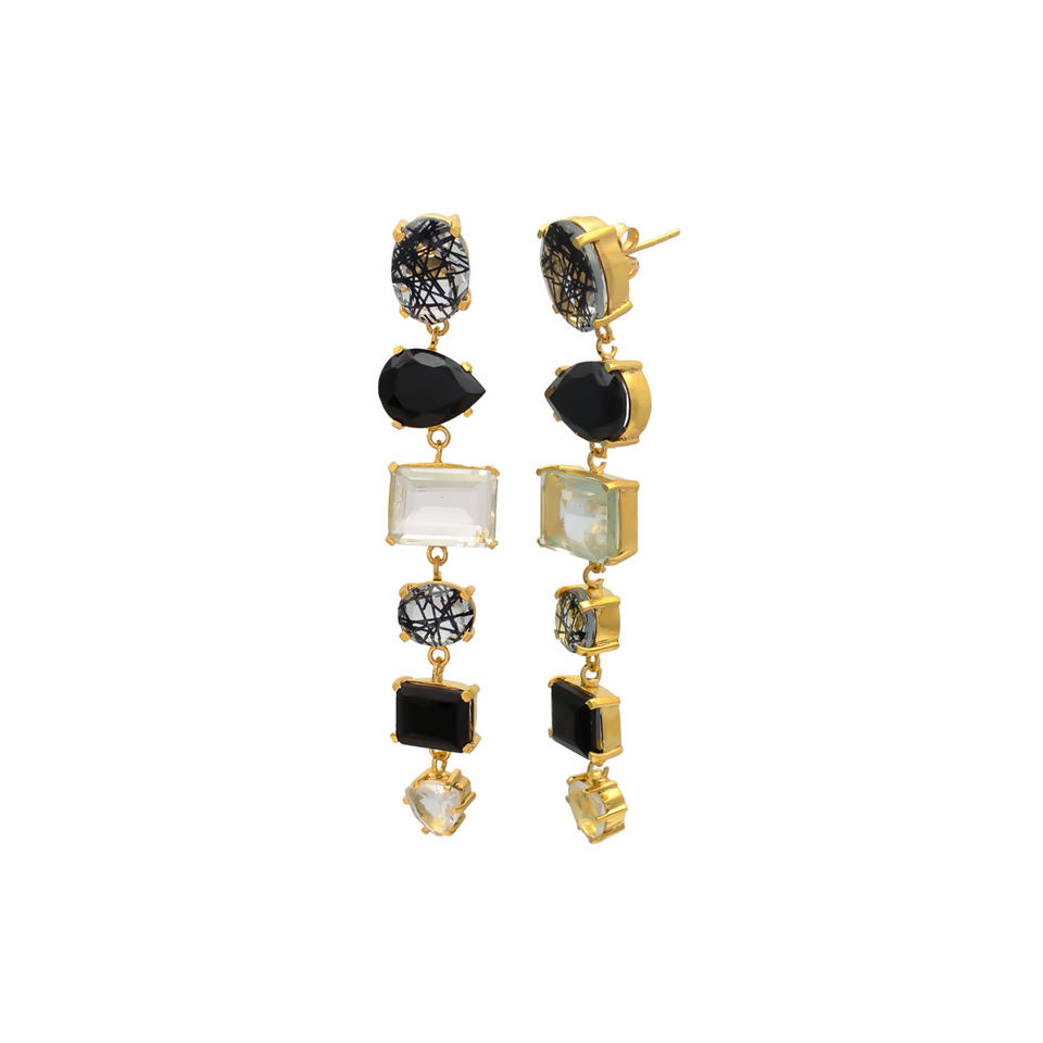Arete de piedra preciosa en forma de pera, Arete de latón chapado en oro, ónix negro y rutilo negro, 12x16 MM