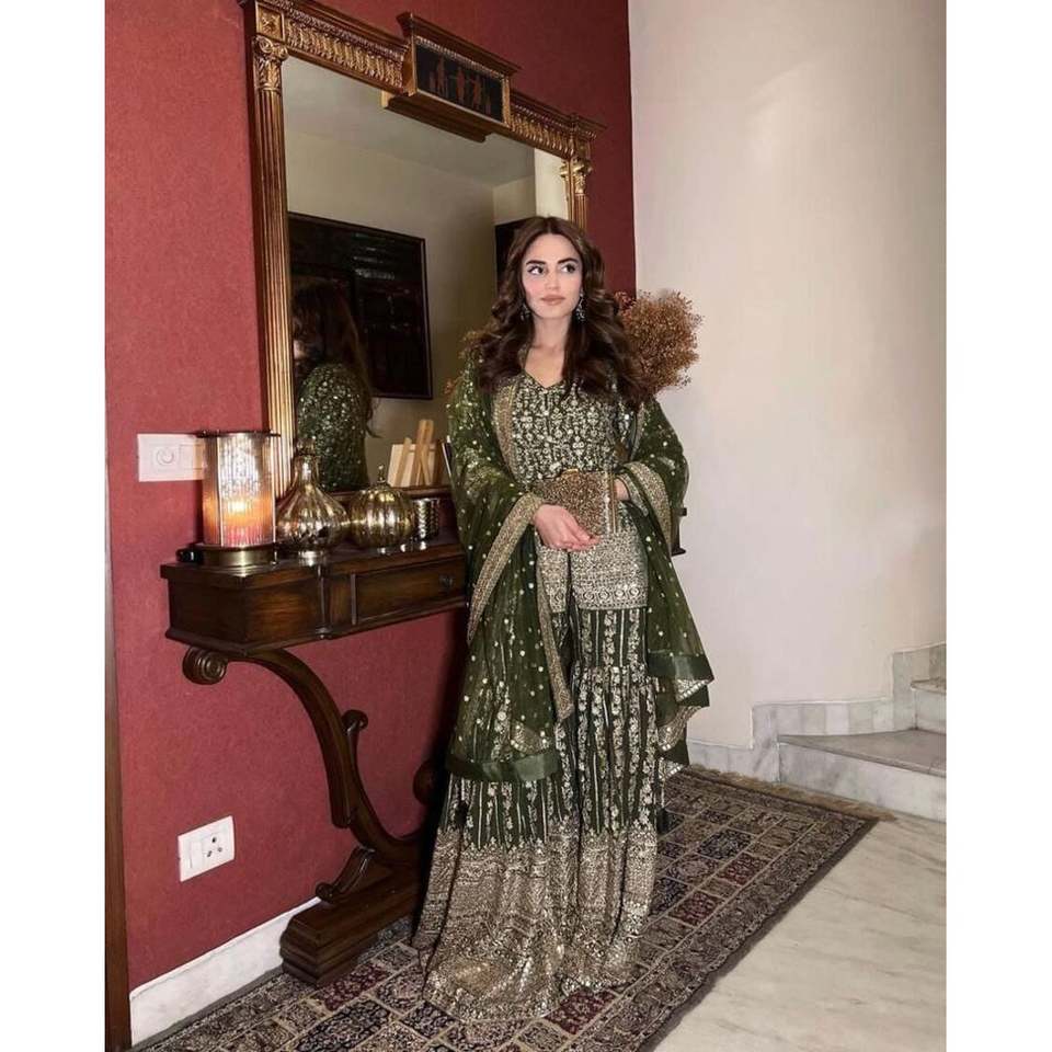NUEVA LLEGADA GEORGETTE BORDADO SECUENCIA TRABAJO TOP SHARARA CON DUPATTA MEHENDI
