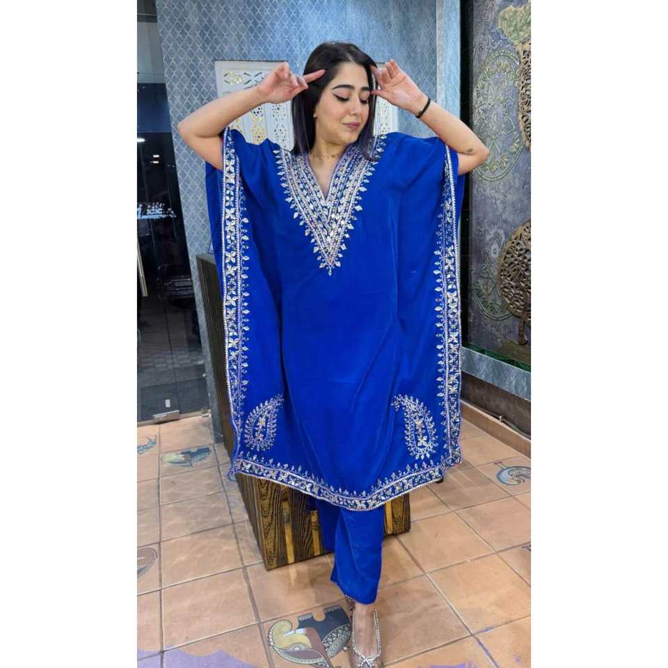 NUEVA LLEGADA TERCIOPELO BORDADO SECUENCIA TRABAJO KAFTAN CON PANTALÓN AZUL