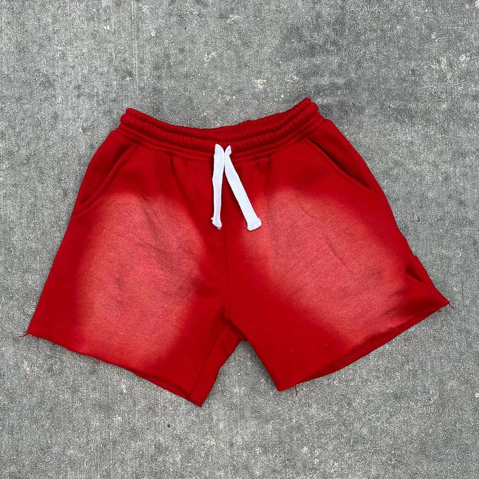 Pantalones cortos de algodón para el sudor con tinte solar Vintage para hombre, pantalones cortos de lavado ácido con estampado de soplo de borde crudo para hombre