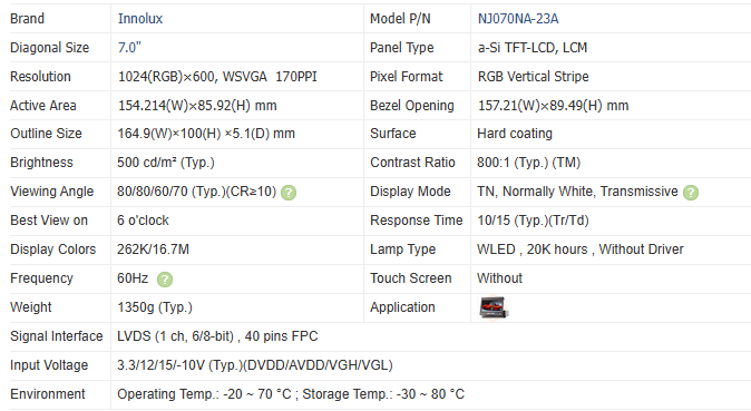 Interfaz de Señal:LVDS (1 canal, 6/8 bits), FPC de 40 pines