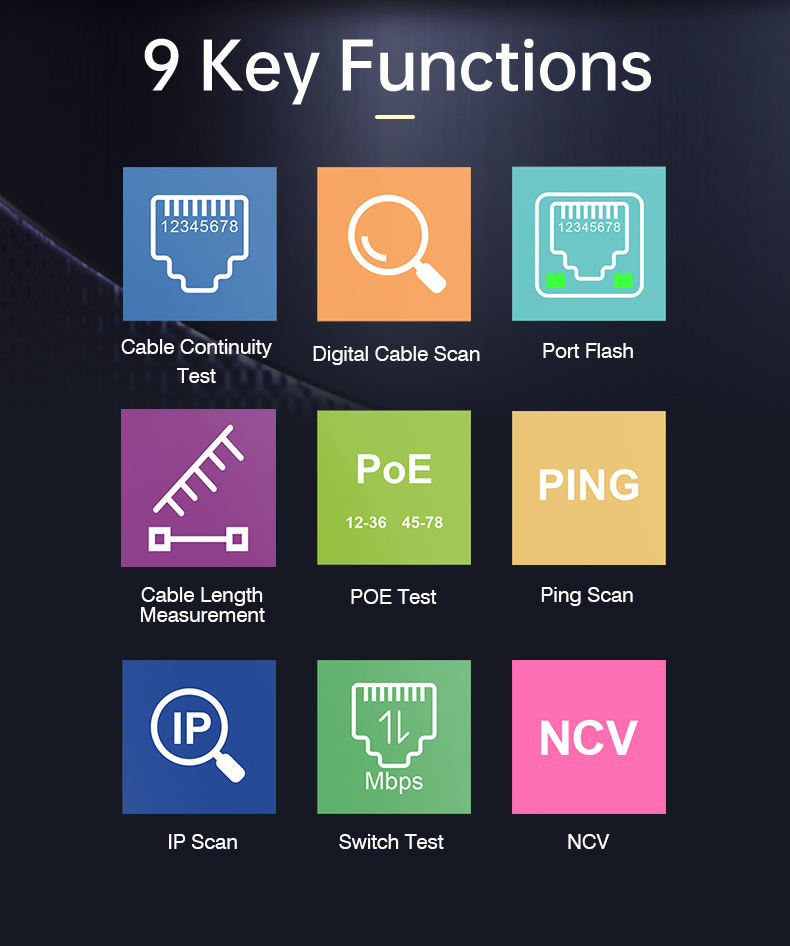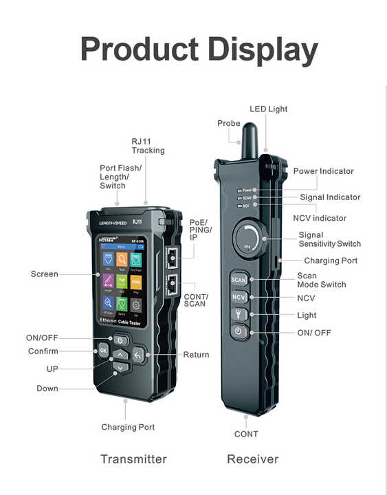 NOYAFA NF-8506 RJ45 CAT5 CAT6 Probador de Cables de Red, Rastreador de Cables, Probador PoE BT, Escáner IP, Buscador de Líneas