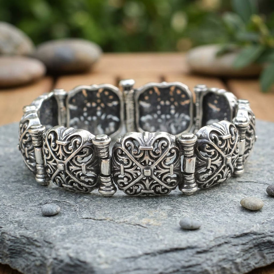 NUSRET Brazalete Étnico de Plata de Ley 925 con Patrón Calado y Diseño Cuadrado Abombado, Brazalete Fino de 45.56g y 19.5cm