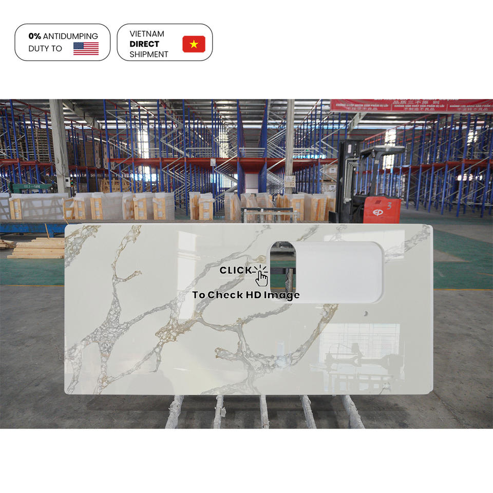 Losa de cuarzo de gama alta NV876, aspecto de mármol mimético, isla de cocina espaciosa, Calacatta, venas elegantes doradas, losa de piedra de cuarzo Artificial