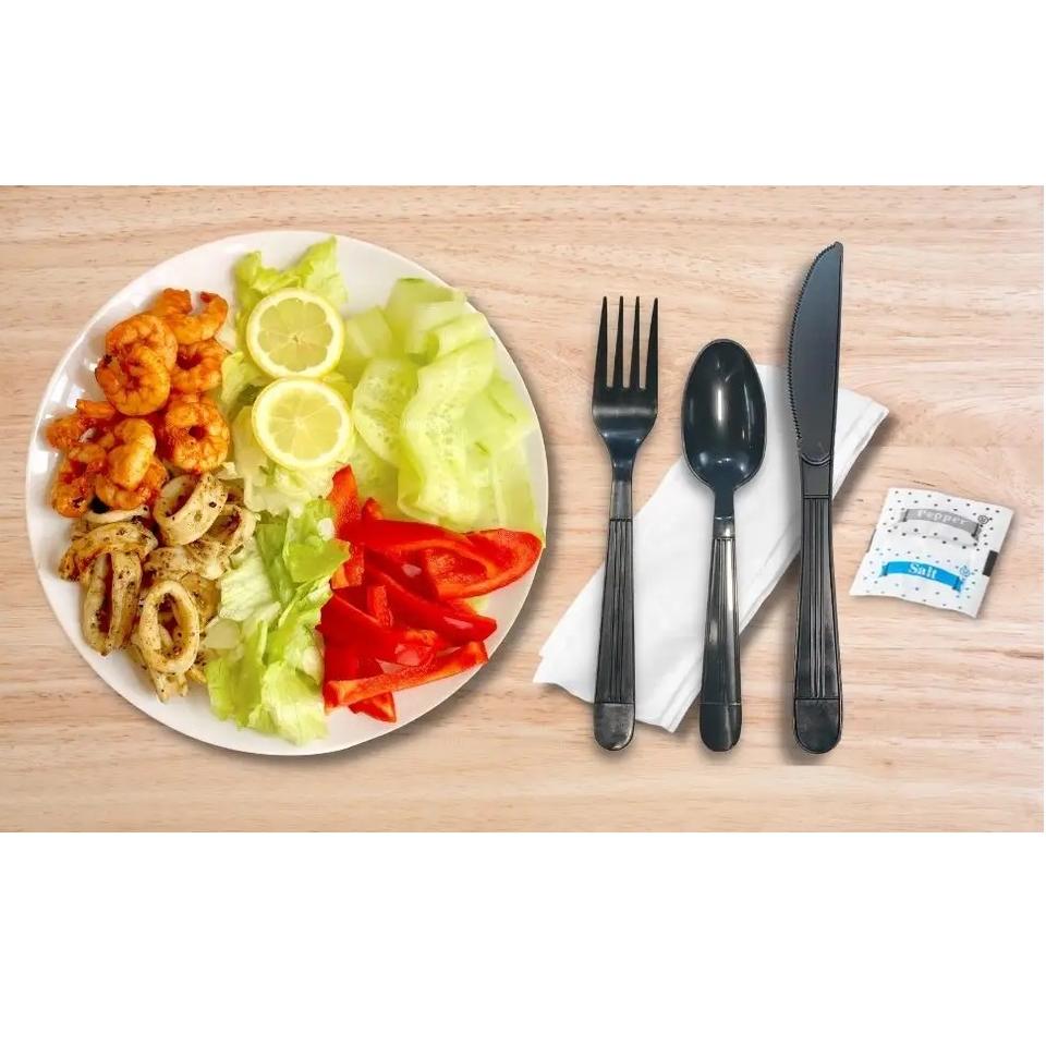 Servilleta Vajilla de plástico Película de alta calidad Envuelto KITS de plástico resistente Juego de cubiertos Paquete con cuchillo Tenedor Cuchara