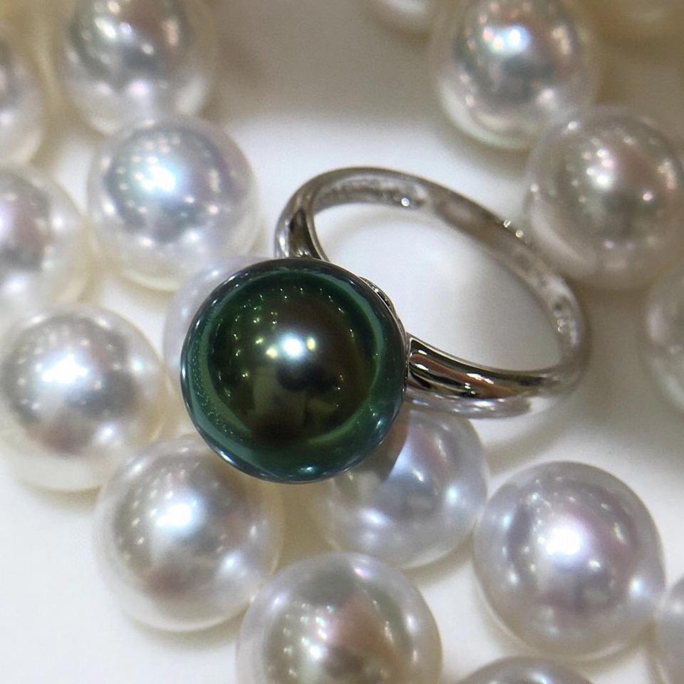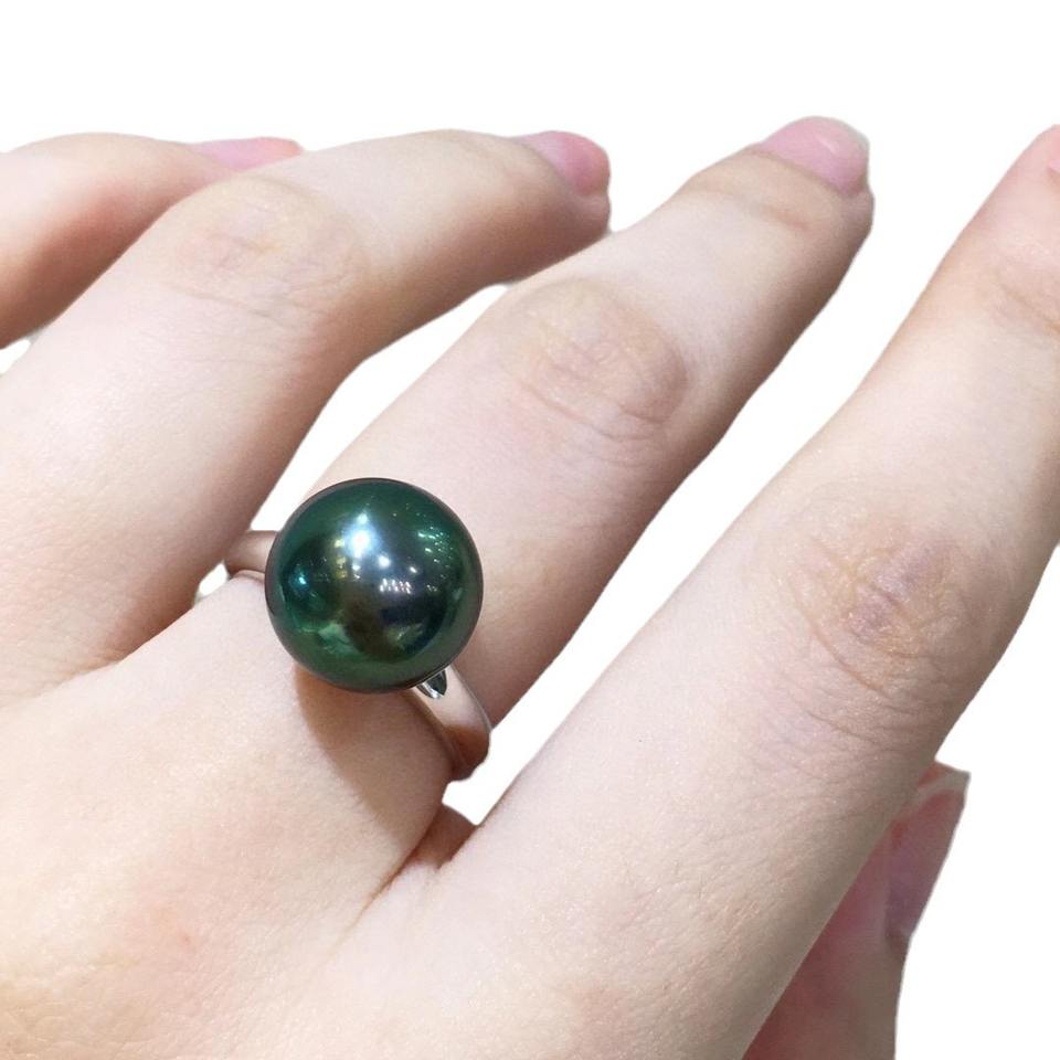 Anillo de Plata de Ley 925 Natural con Perla Verde Pavo Real y Negra de 11-12 mm, Diseño Redondo Impecable con Boca Abierta