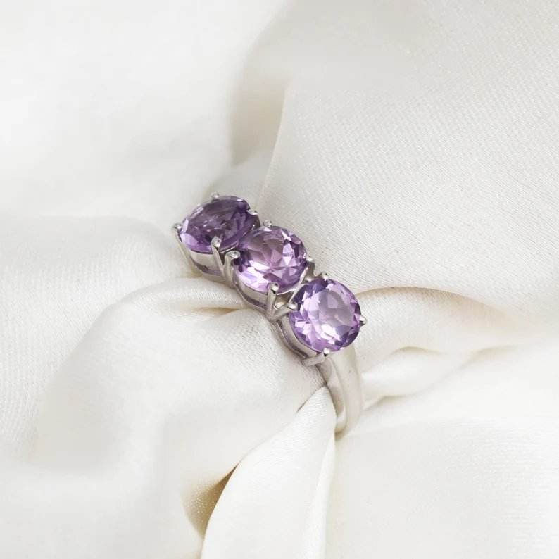 Anillo de ajuste de tres piedras clásico de Plata de Ley 925 de corte redondo de amatista Natural para mujer, compromiso o fiesta, regalo de boda