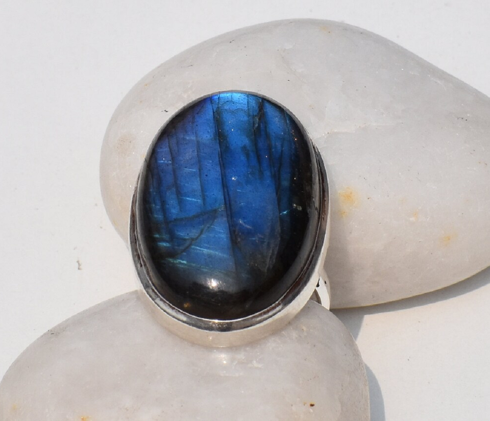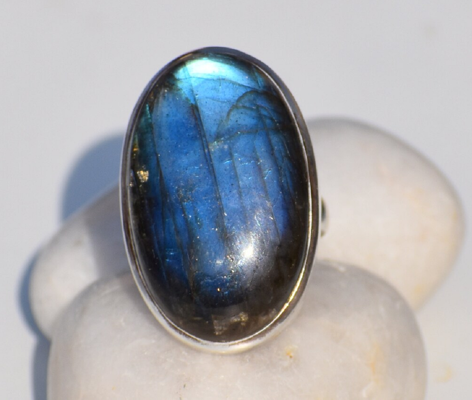 Anillo de labradorita azul fuego natural, plata de ley 925, hecho a mano, joyería de piedras preciosas de labradorita, anillo de boda, regalo para hombres y mujeres