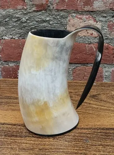 Taza de cuerno de búfalo natural hecha a mano con accesorios de latón y asa para beber estilo vikingo a precio al por mayor