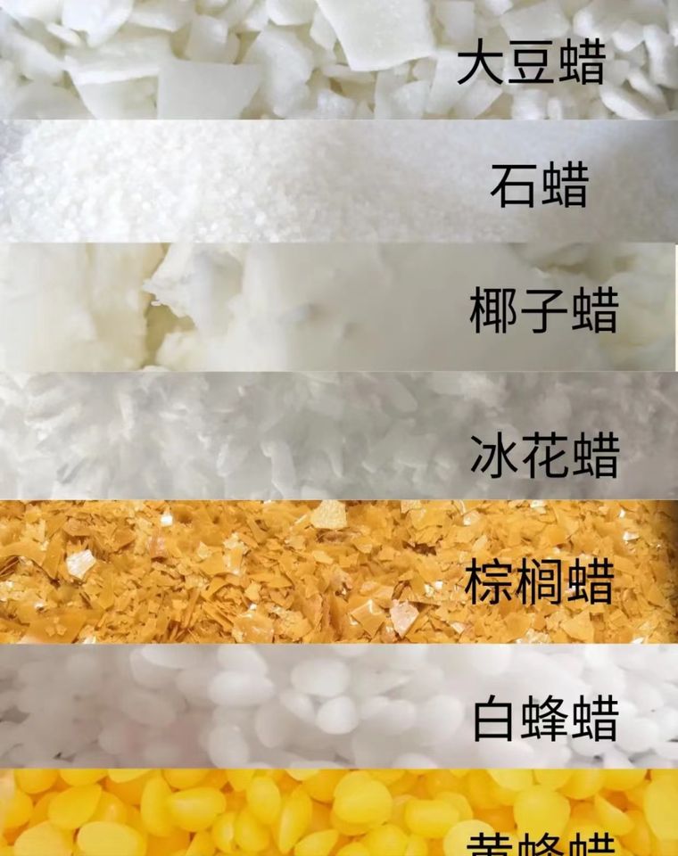 Cera de abejas, Cera de soja, Cera gel, Parafina, Cera de palma, De coco ceraMaterial