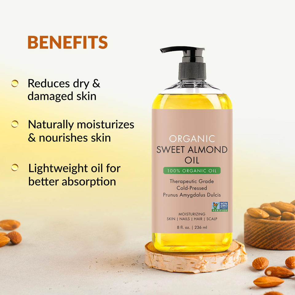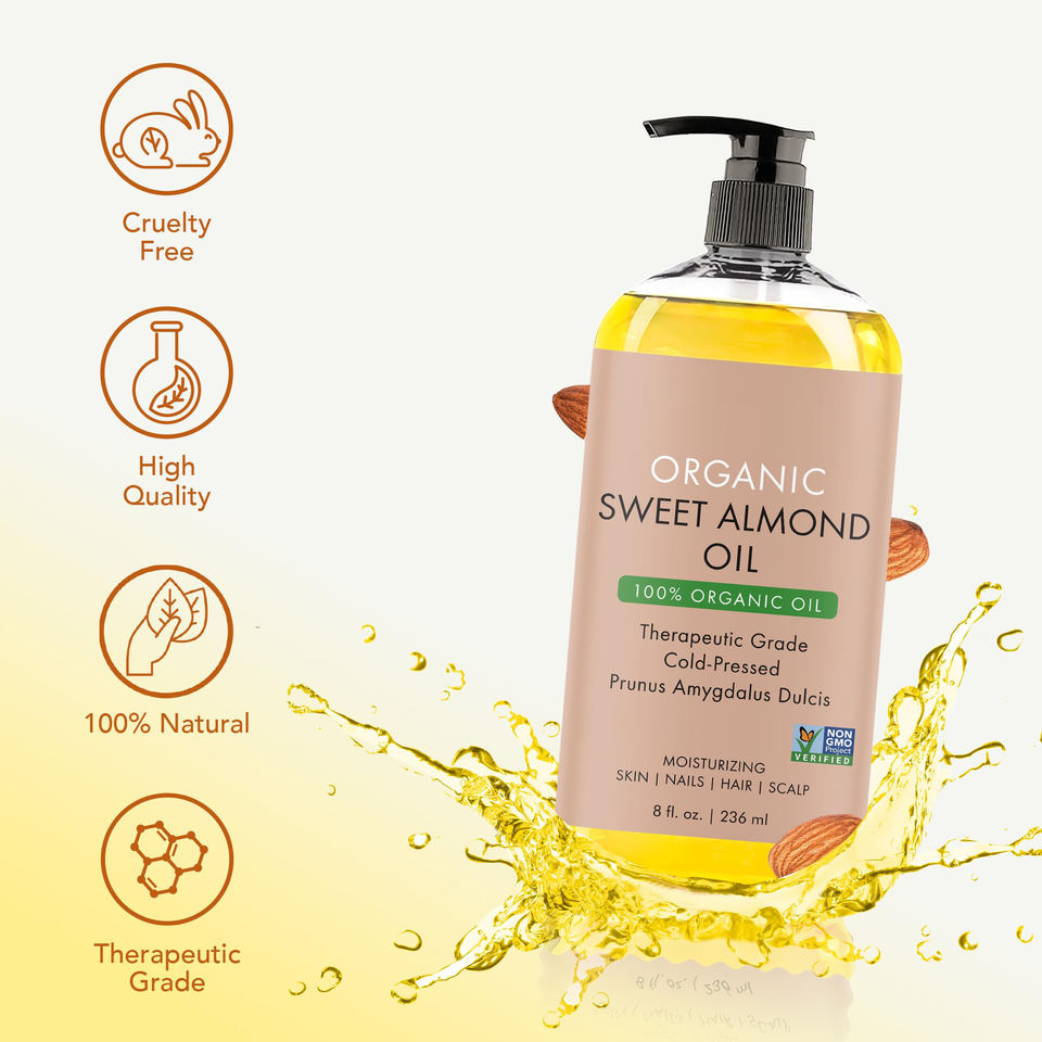 Aceite corporal de almendra dulce orgánico USDA prensado en frío natural para piel, cara, uñas, cuero cabelludo y masaje