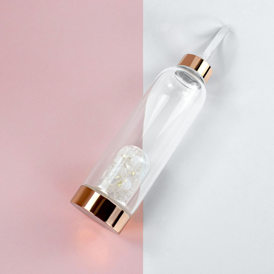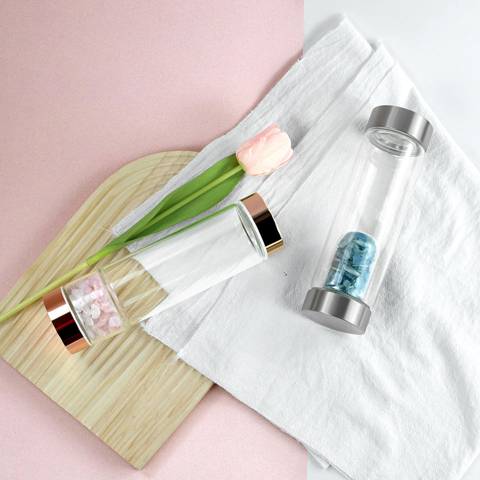 Elixir de cristal natural botella de agua de vidrio de borosilicato curativo botella de agua con infusión de piedras preciosas de cuarzo rosa real para mujeres