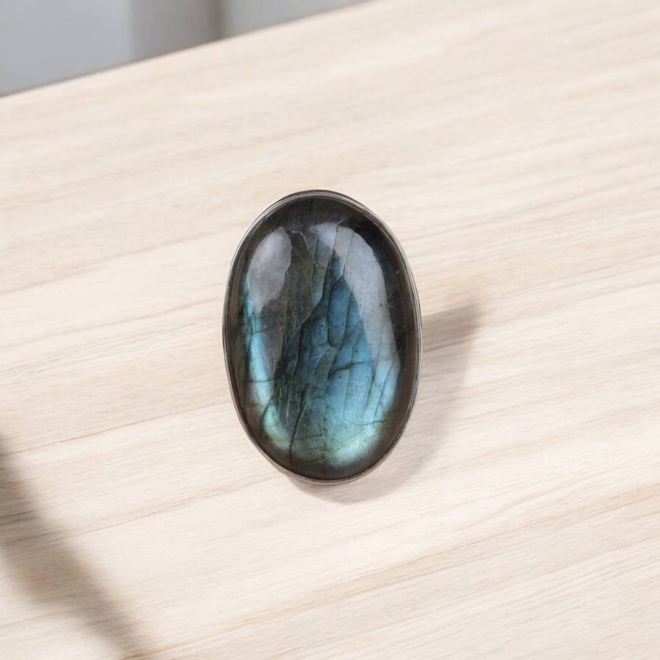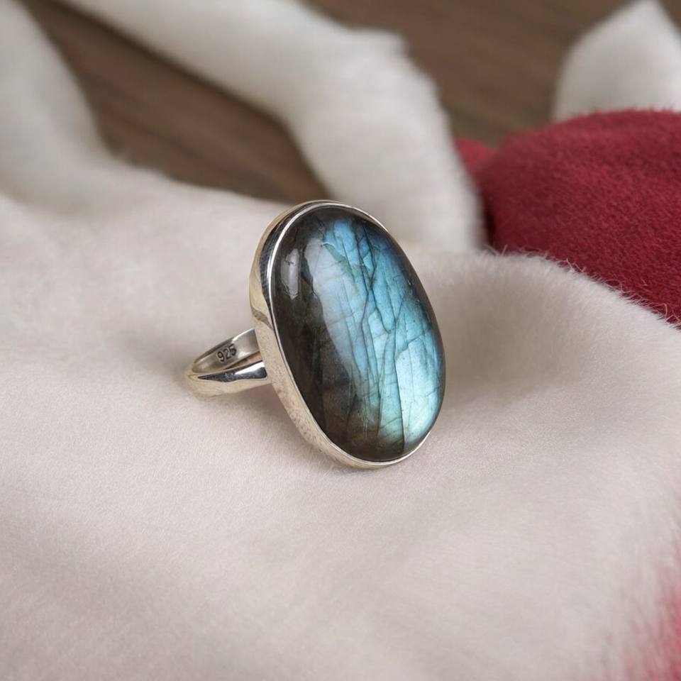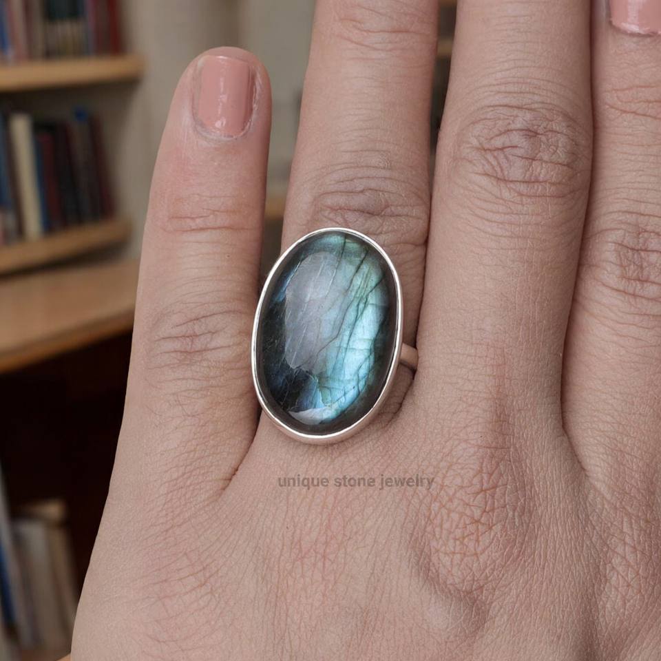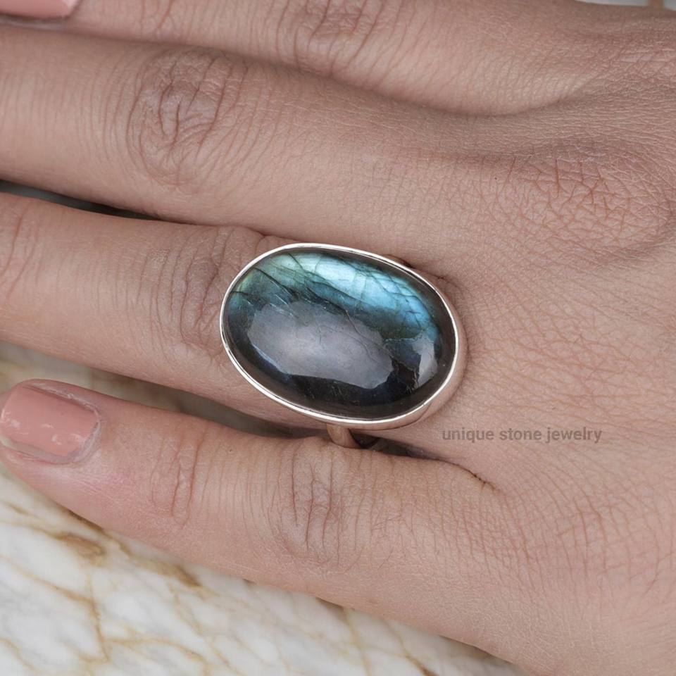 Anillo de compromiso de plata de ley 925 con labradorita natural de corte ovalado, hecho a mano, estilo bohemio, para mujer.