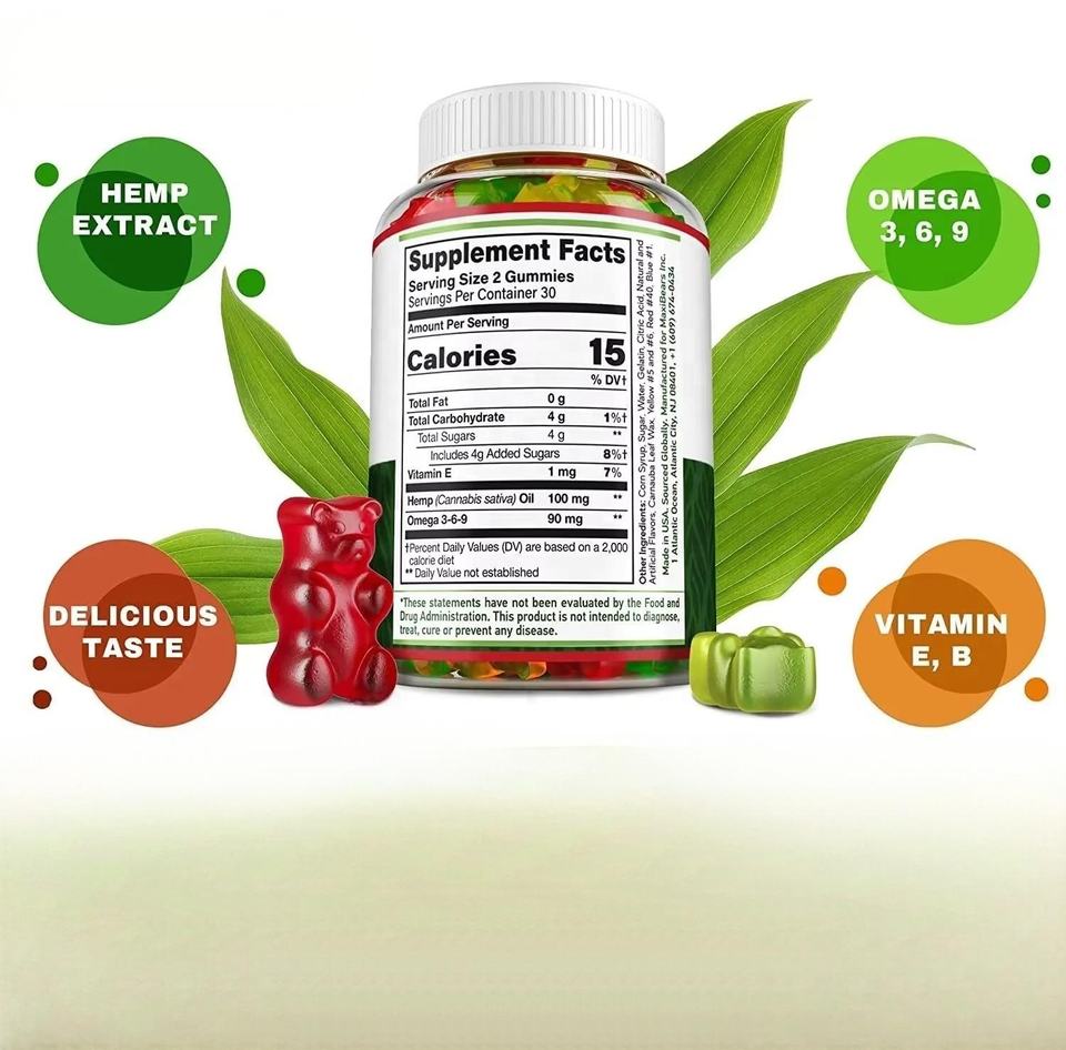 Gomitas de Extracto de Semillas de Cáñamo Natural Omega 3 6 9 Sin Gluten Suplemento Dietético 60 Unidades