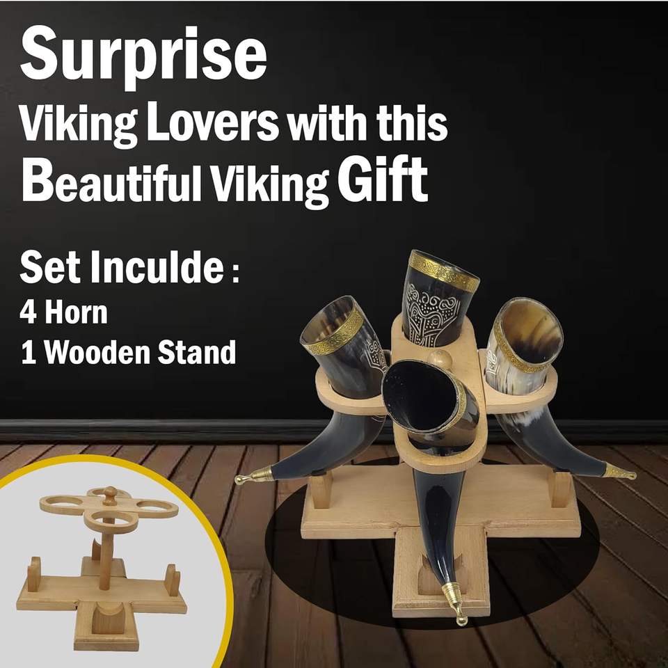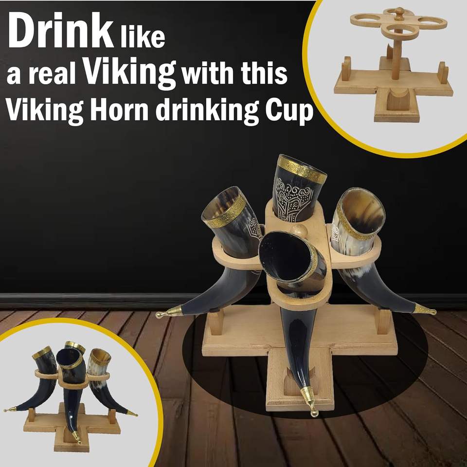 Cuerno para beber de búfalo natural tallado a mano auténtico con soporte de madera de lujo para ventilador de mitología nórdica en la costa más baja