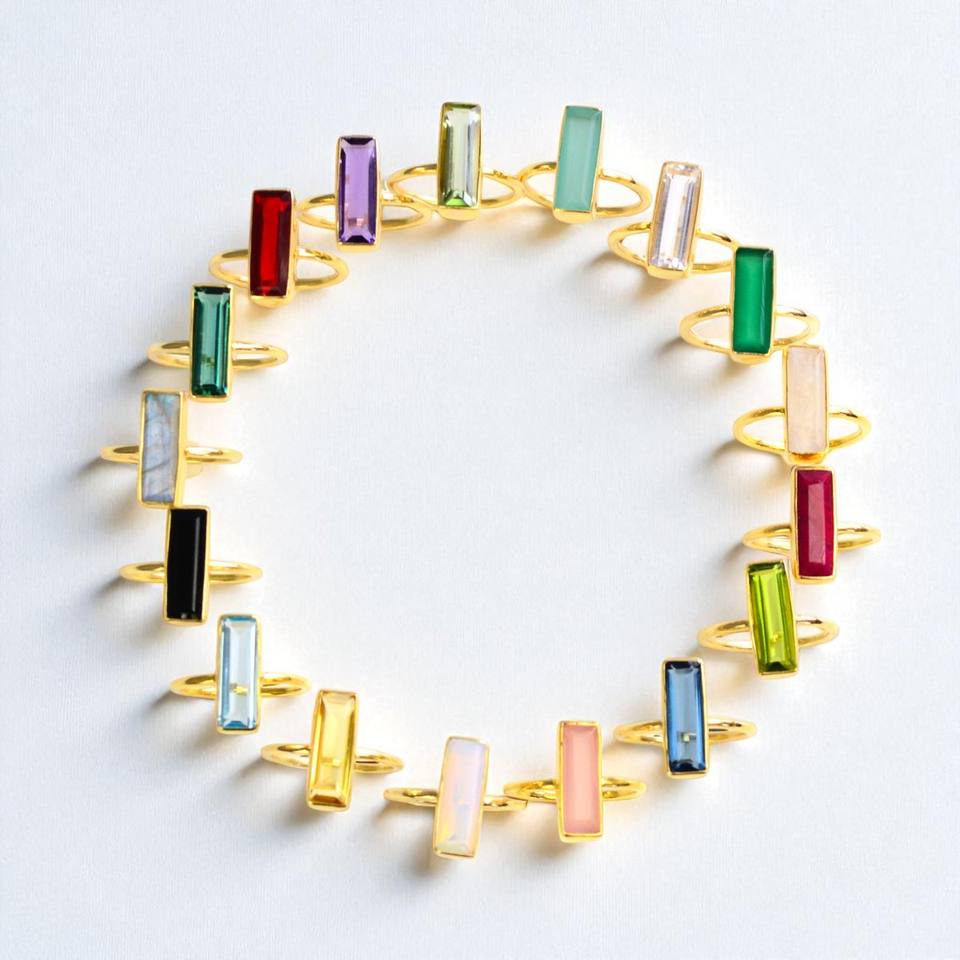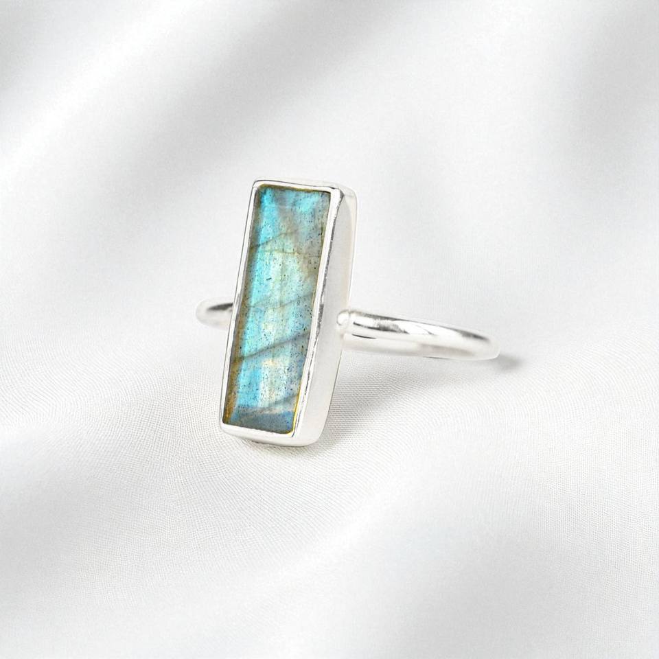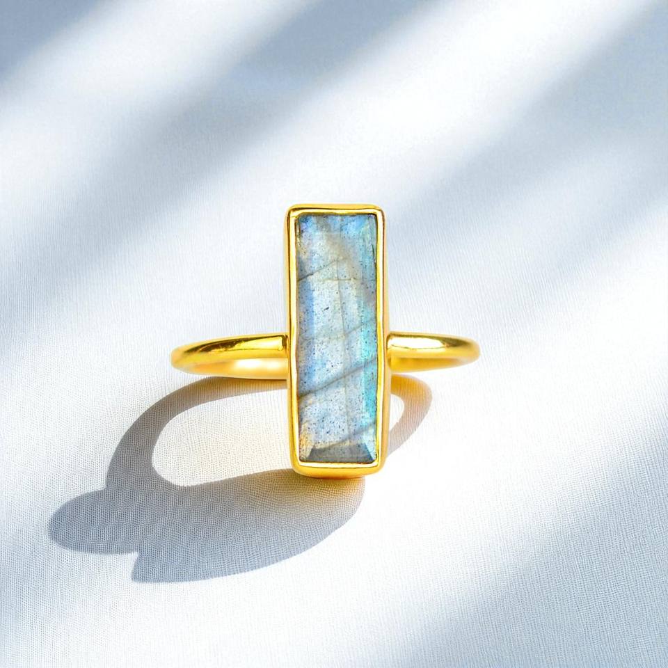 Anillos con Bisel Rectangular de Labradorita Natural, Piedra de Nacimiento | Anillos de banda chapados en oro hechos a mano | Joyas Minimalistas Apilables Lisas