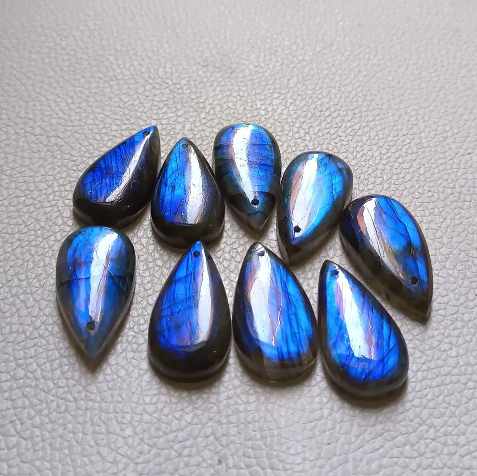 Cabujón de Labradorita Natural en Forma de Pera con Destello Azul, Gema Suelta Perforada con Reverso Plano Calibrado, Suministro para Fabricación de Joyería al por Mayor