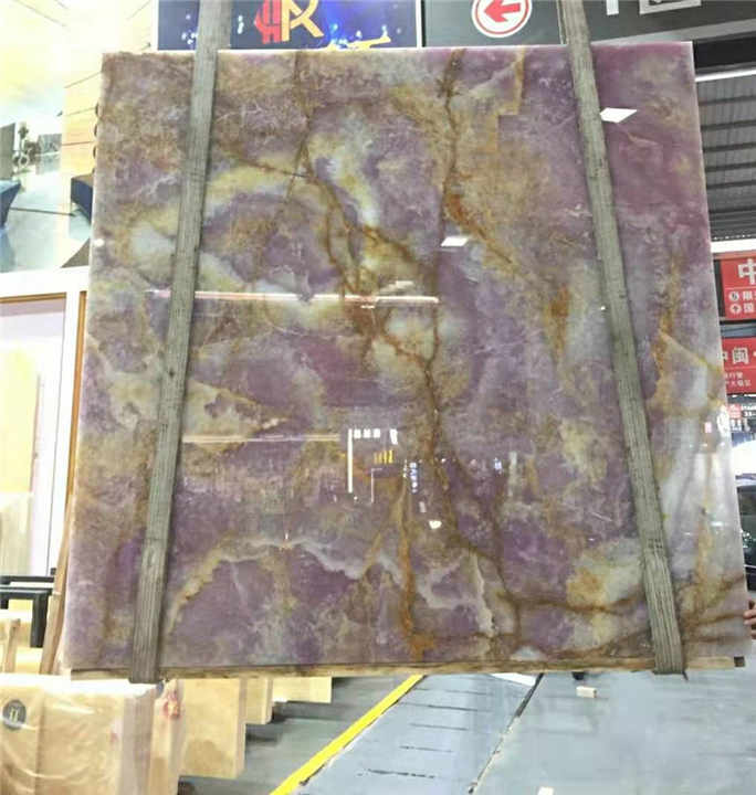 Panel Decorativo de Pared para Villa Moderna, de Piedra Natural Goldtop, Translúcida, Pulida, Retroiluminada, Ónix Morado, Gran Losa de Mármol