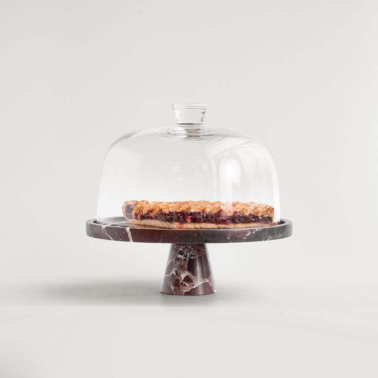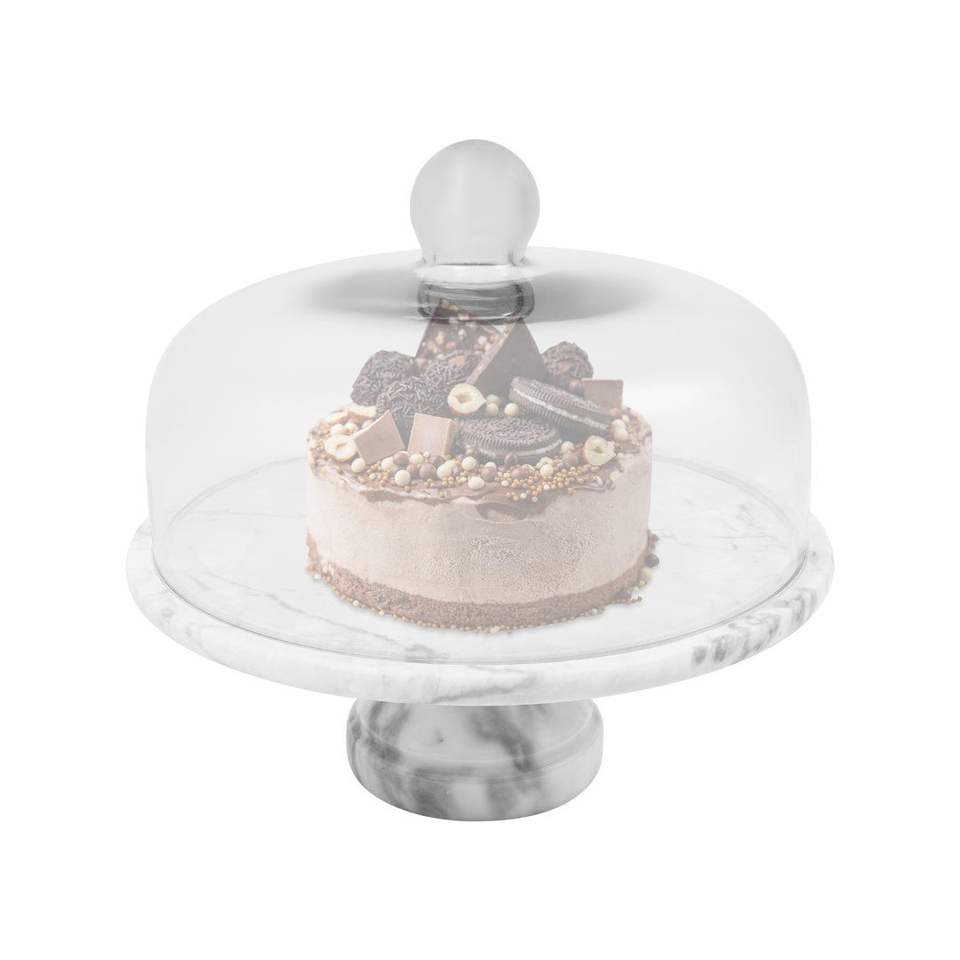 Base para pastel de mármol natural con cubierta de vidrio para exhibir pasteles, repostería y cupcakes en la mesa de comedor.