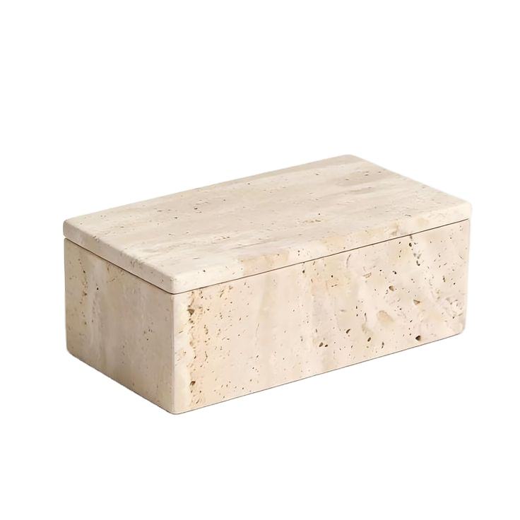 Caja de Almacenamiento Rectangular de Mármol Travertino Natural con Tapa, Elegante Contenedor Beige para Organización de Baño y Cocina