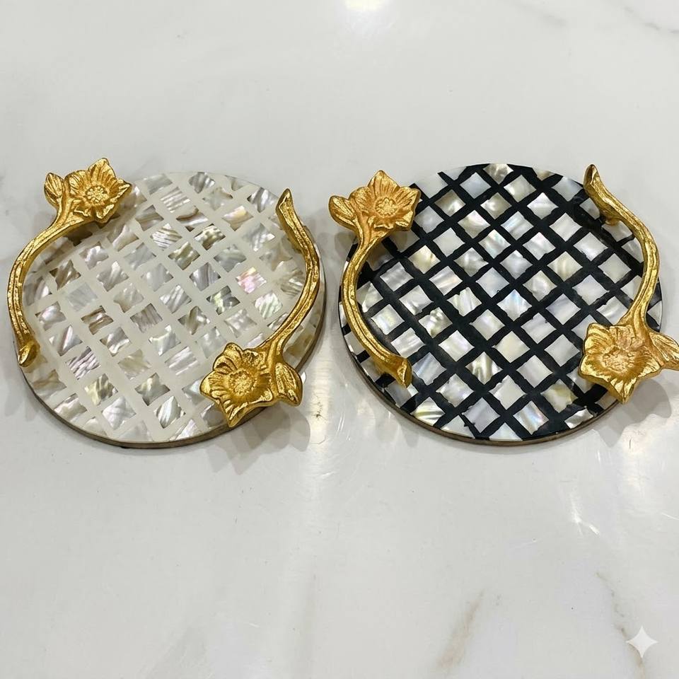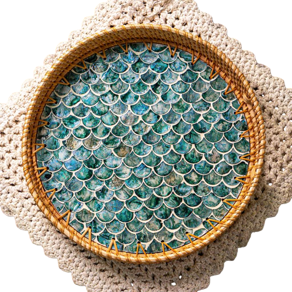 Bandeja Redonda Decorativa con Incrustaciones de Nácar Natural, Diseño Floral Elegante en Rosa y Blanco, para Mesa de Centro, Otomana o Cocina