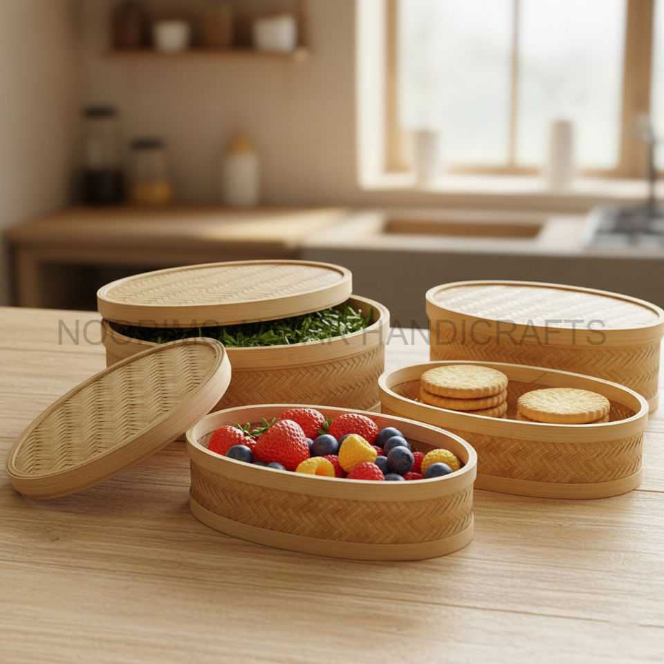 Caja de Bambú Ovalada Natural, Organizador de Almacenamiento Tejido a Mano, Duradero, Proveedor a Granel para el Hogar, Exportador de Fábrica
