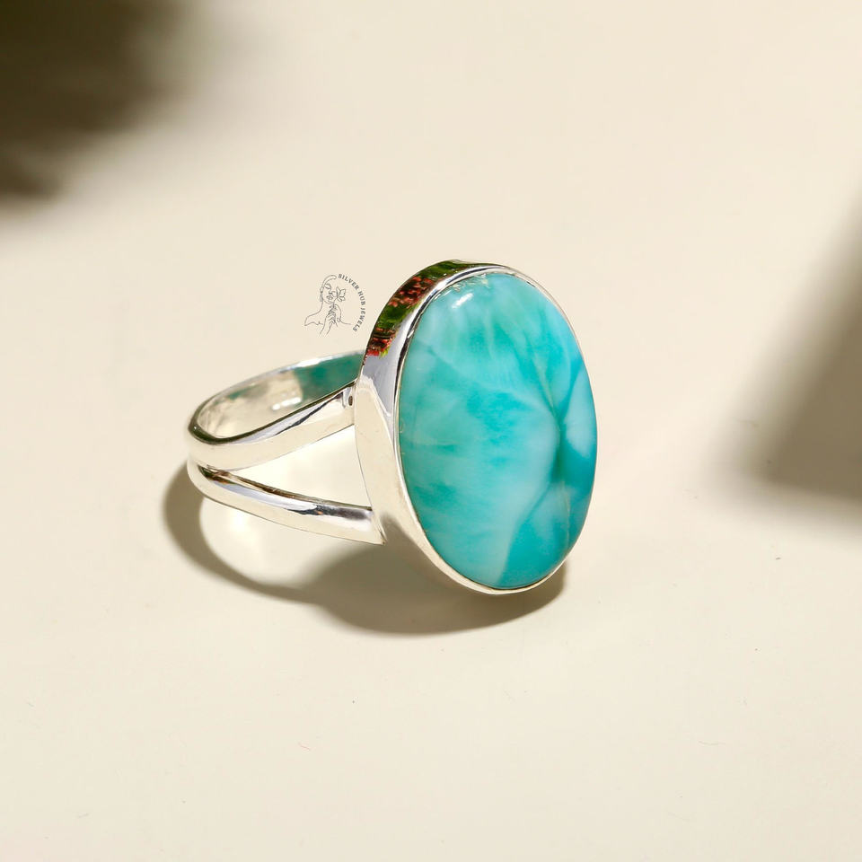 El anillo de forma ovalada natural viene con piedras preciosas de Larimar disponibles en precio al por mayor de alta calidad Anillo bohemio de plata esterlina 925
