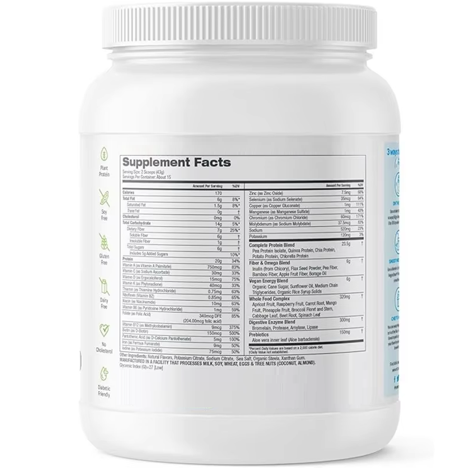 Ingrediente principal:Mezcla Completa de Proteínas, Mezcla de Fibra y Omega, Mezcla Energética Vegana, Complejo de Alimentos Integrales, Mezcla de Enzimas Digestivas