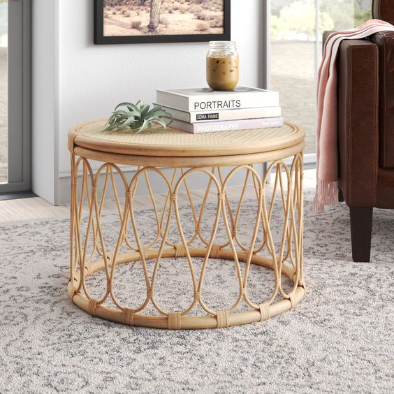 Mesa redonda de ratán natural elegante para café y té con tapa de cristal y base de caña