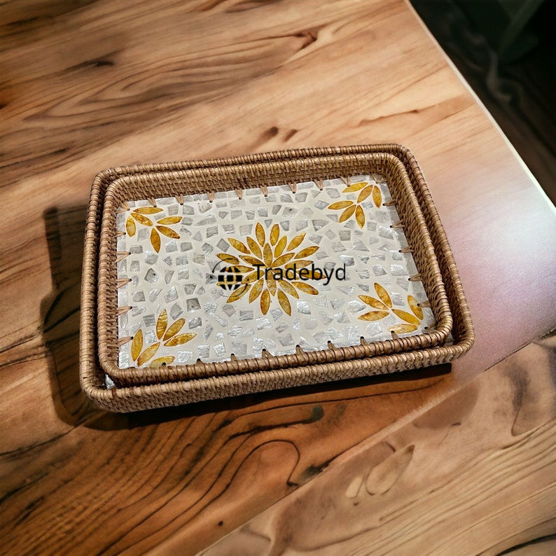 Bandeja de Servicio Móvil Moderna Tejida a Mano de Ratán Natural Premium, Organizador de Decoración para el Hogar Tradebyd