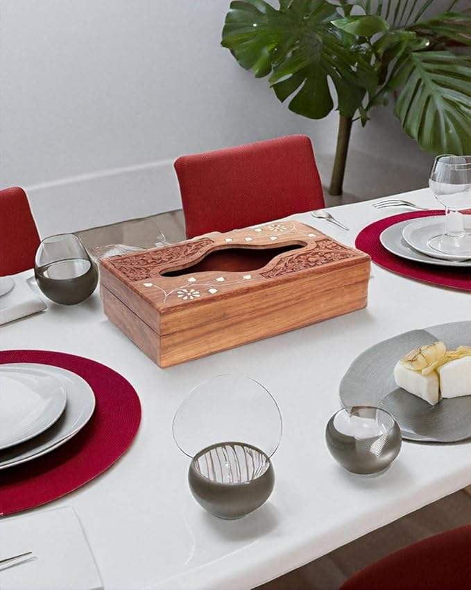 Soporte de caja de pañuelos de madera maciza natural con talla artística y pulido brillante para sala de estar y dormitorio al precio más barato