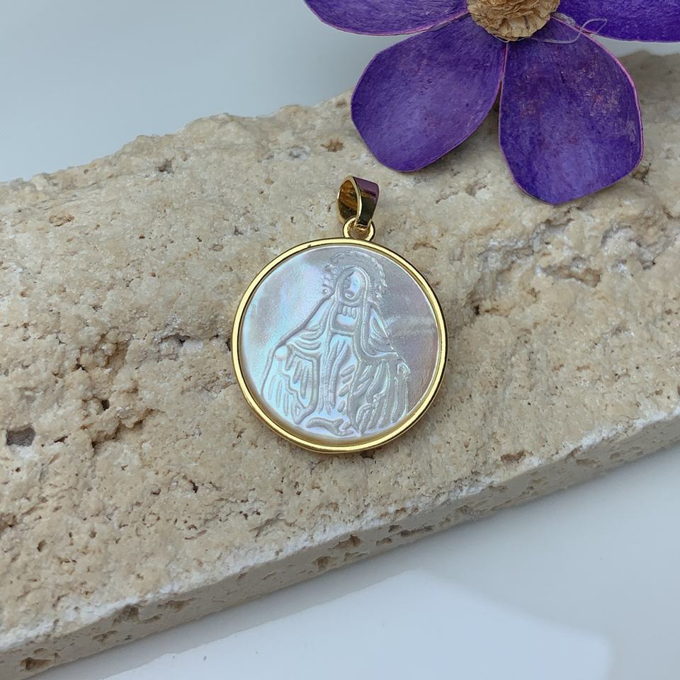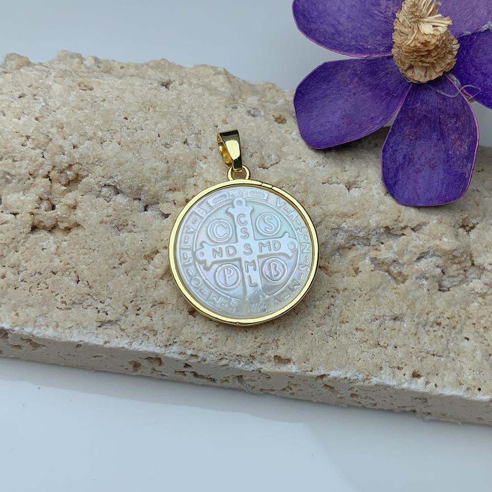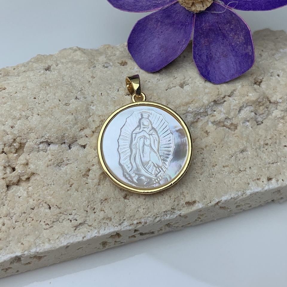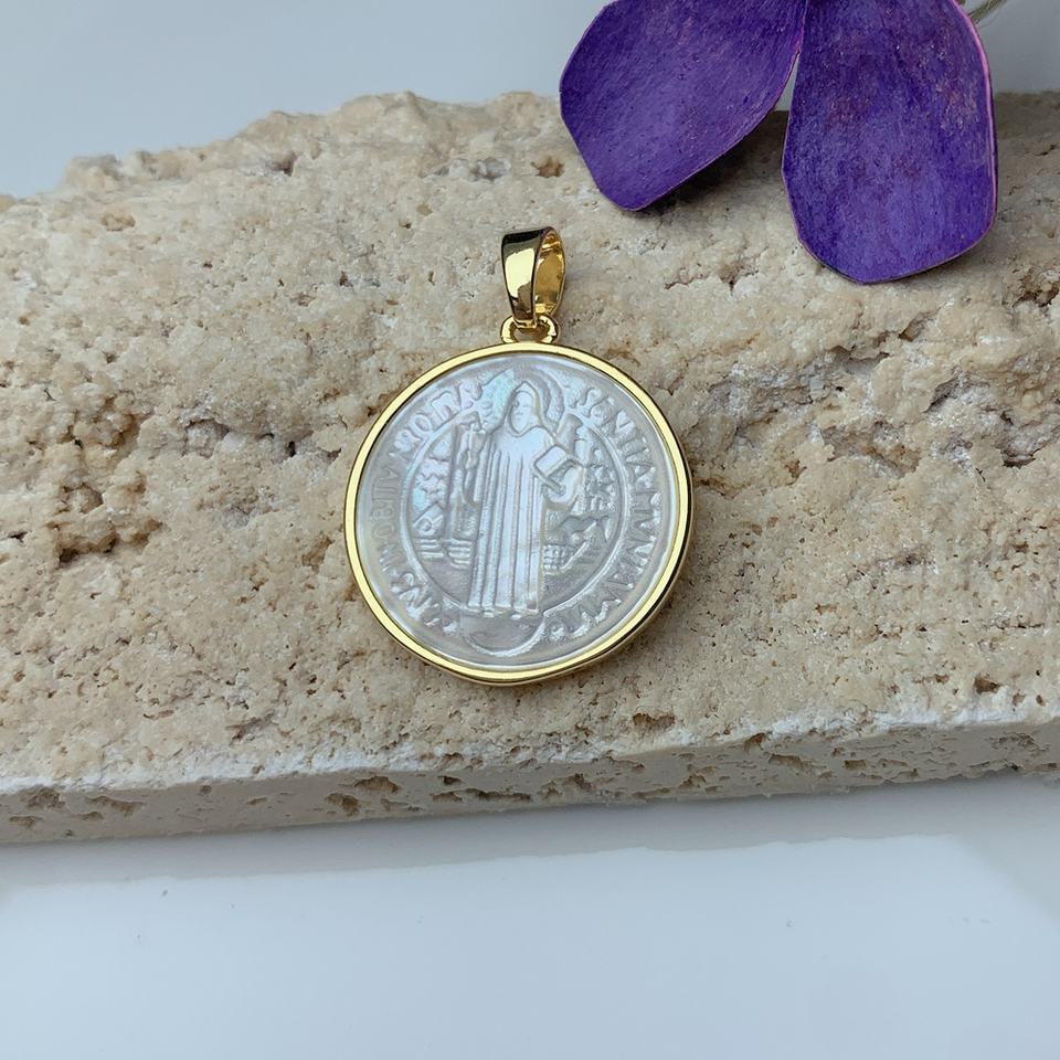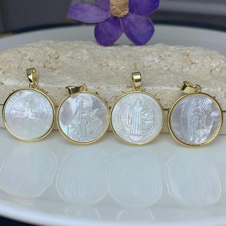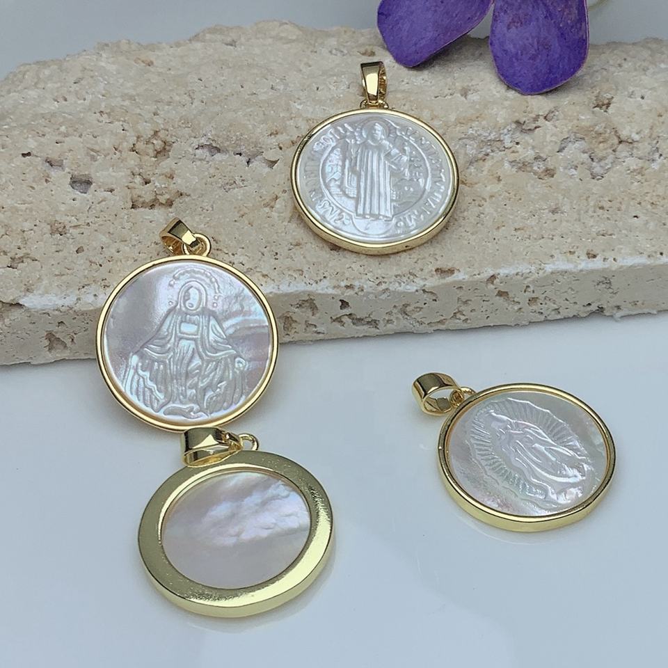 Colgante redondo en concha marina blanca natural con Cruz de San Benito y Virgen de Guadalupe, dijes para fabricación de joyería