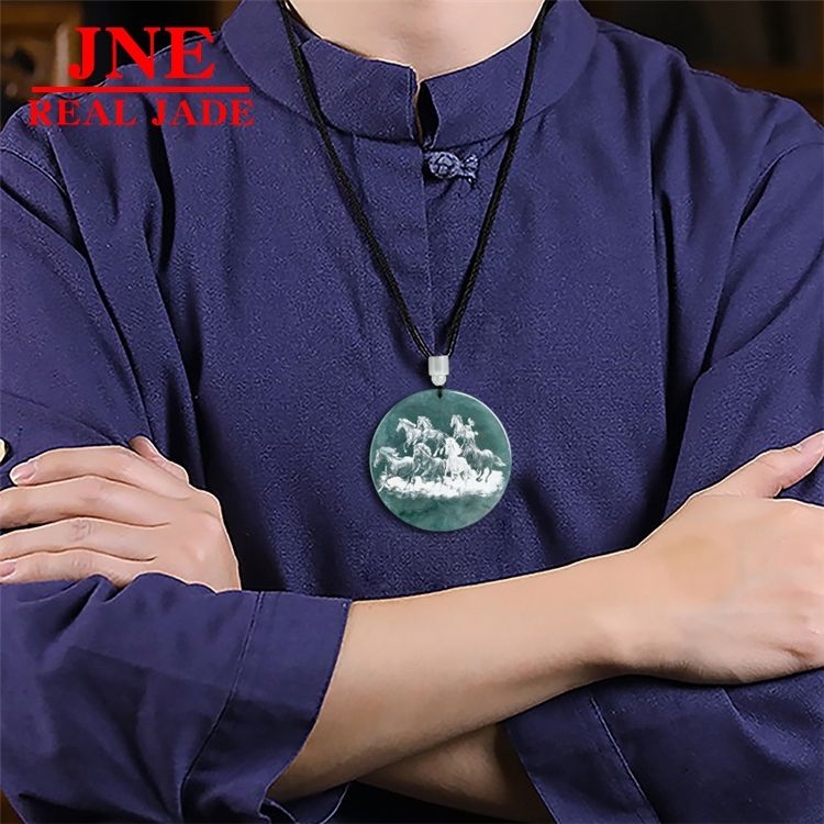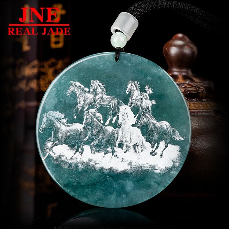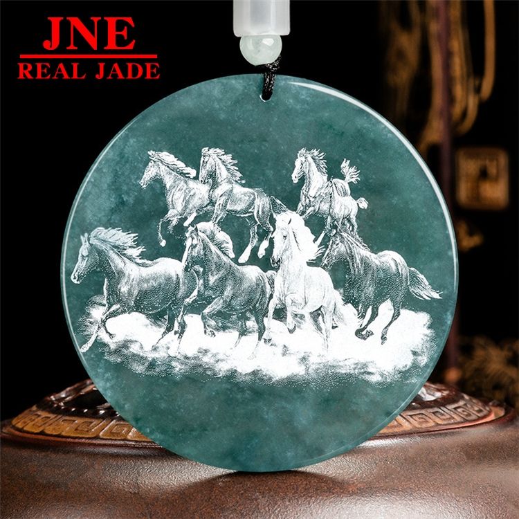 Colgante de Jade Natural Tipo A, Grabado con Sombra de Agua Azul, Paisaje de Dos Caballos, Jade de Hielo, Zodiaco Chino, para Hombre y Mujer