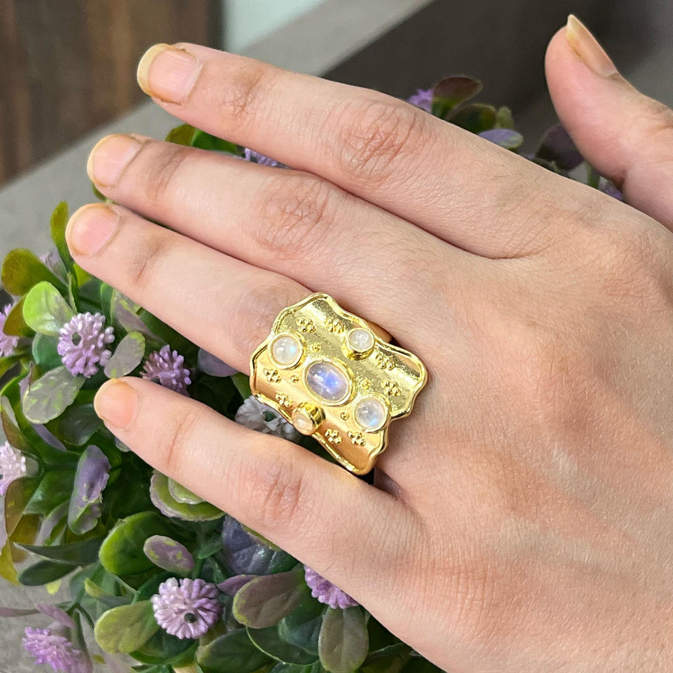 Anillo de Piedra Lunar Natural Multicolor, Ovalado y Liso, Chapado en Oro de 18k, Estilo Bohemio Vintage, Ajustable