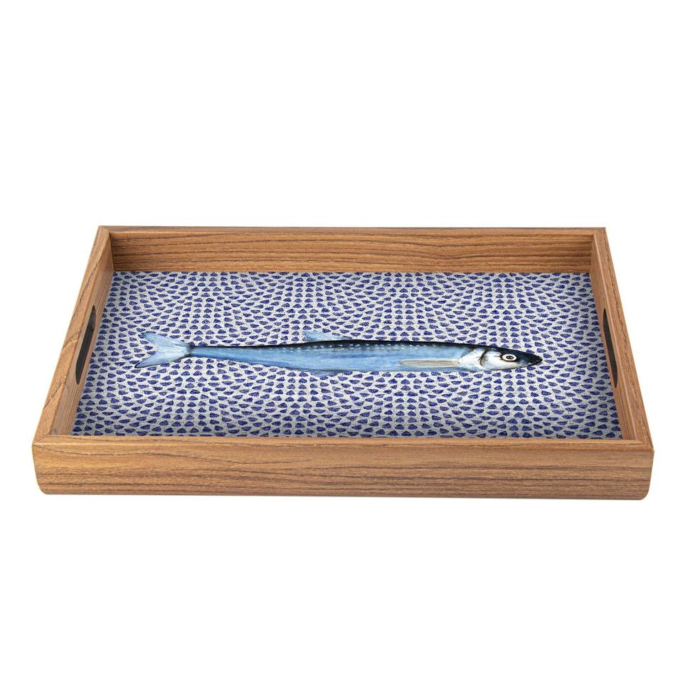 Bandeja Decorativa Rectangular con Estampado de Peces y Gotas en Azul Náutico, Bandeja de Servir Artesanal de Madera de Mango para Pedidos al por Mayor