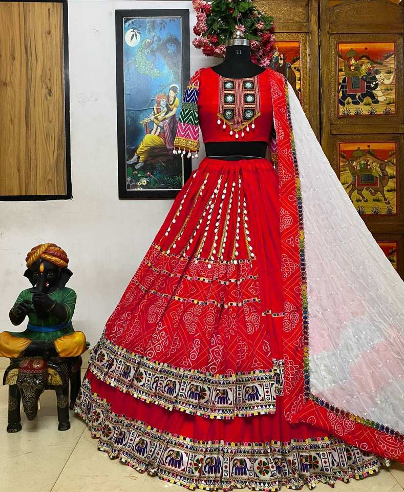 Nombre del producto:Lehenga Choli y Dupatta Impresión de algodón de muselina y trabajo de espejo real