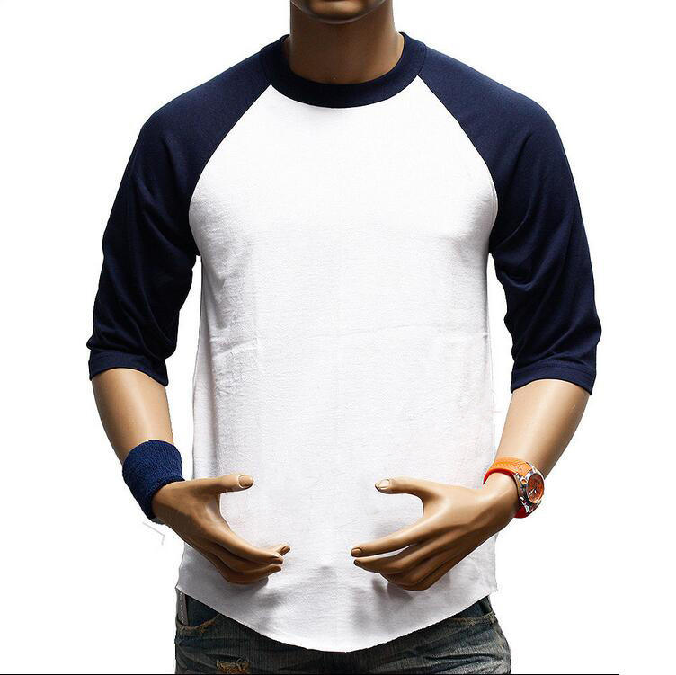 Azul marino 3/4 Raglan camiseta Crew hombres camiseta curva dobladillo béisbol estilo 100% algodón cuello redondo deporte Casual hombres camiseta