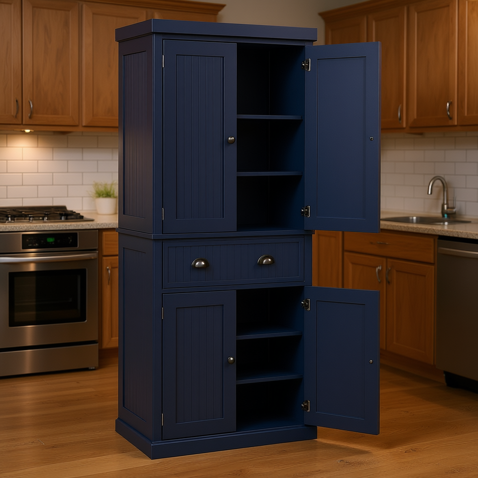 Armario de Cocina Azul Marino de 72 Pulgadas con 4 Puertas, 3 Estantes Ajustables, Cajón Central Grande, Solución de Almacenamiento Moderna