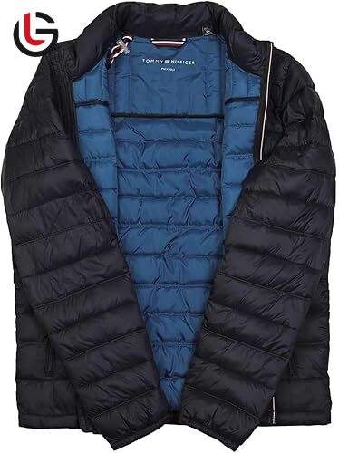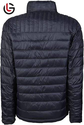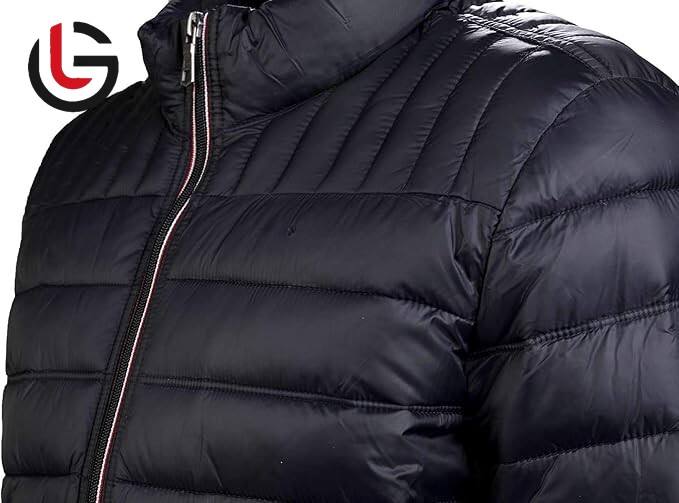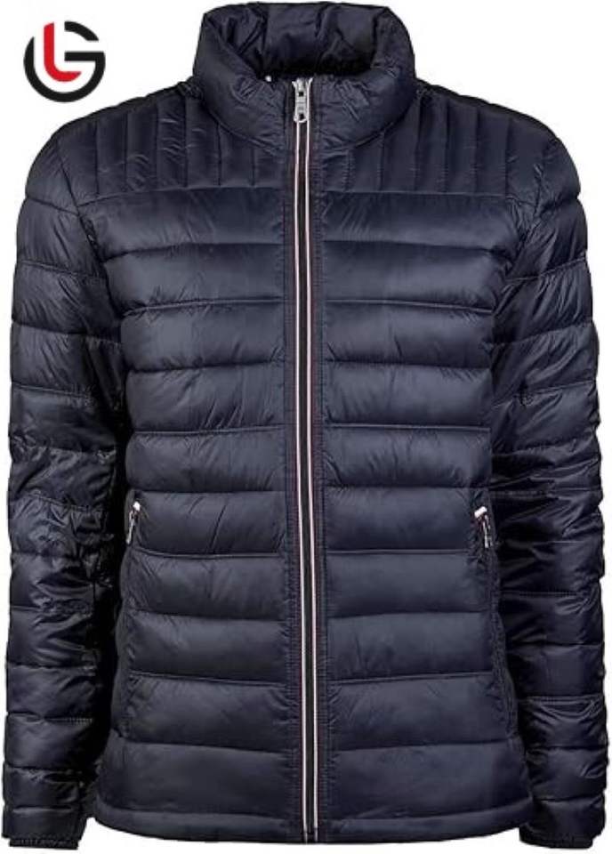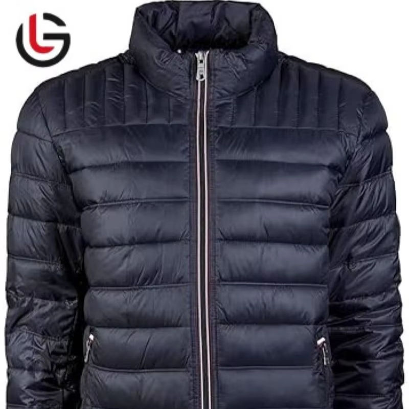 Chaqueta acolchada de invierno para hombre con burbujas azul marino, cuello con capucha acolchado, cierre de cremallera, servicio OEM, pantalla de logotipo frontal, puerta, estilo callejero