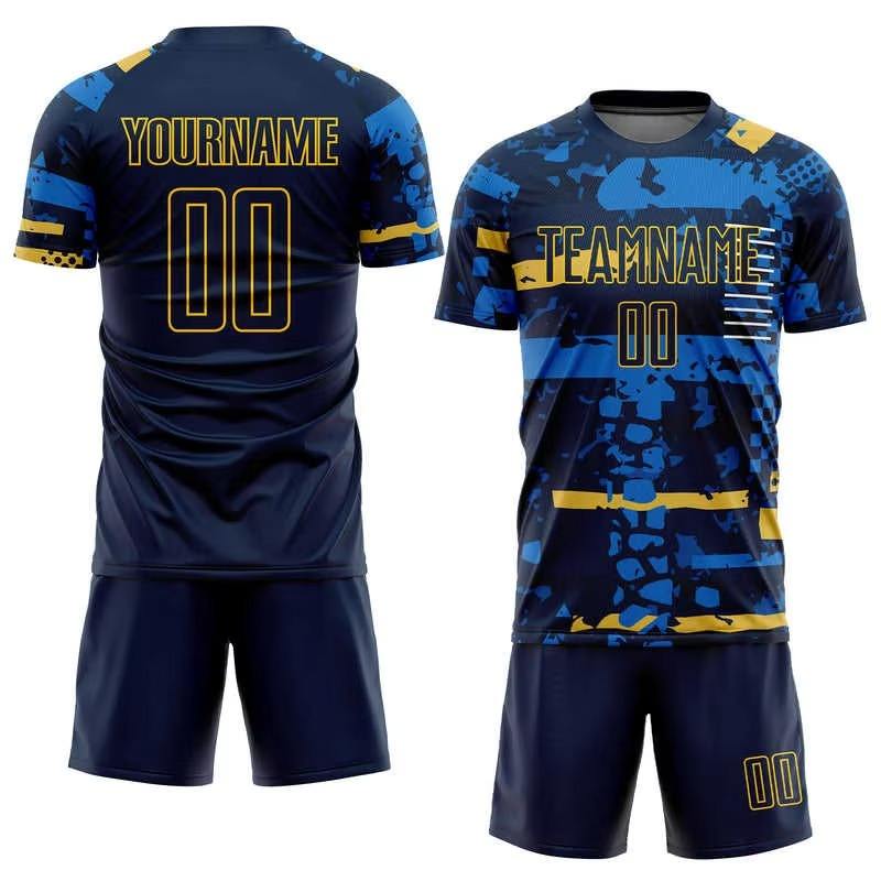 Conjuntos de Camisetas de Fútbol Transpirables Sublimadas en su Totalidad, Color Azul Marino y Dorado, Tallas Grandes, 100% Poliéster, Cuello Redondo, Ligeras