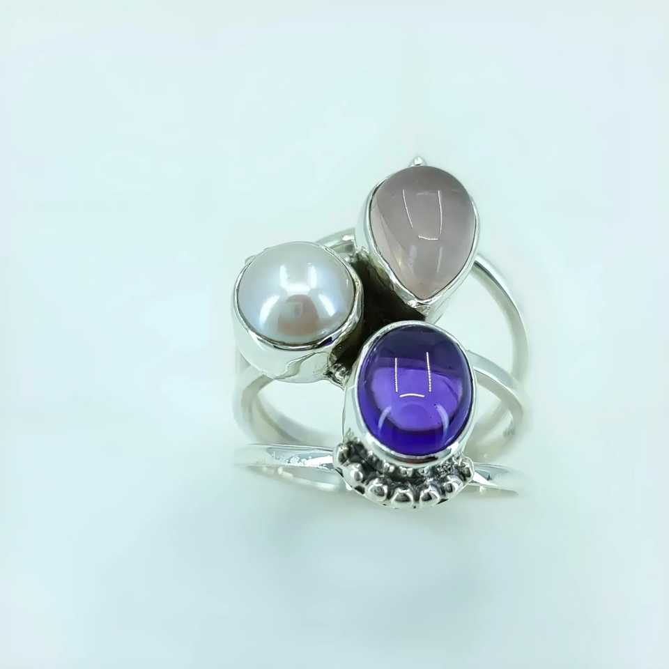 Anillo Boho Navya Craft Hecho a Mano en Plata de Ley 925 con Triple Piedra Preciosa (Amatista, Cuarzo Rosa, Perla) Talla Personalizada 4