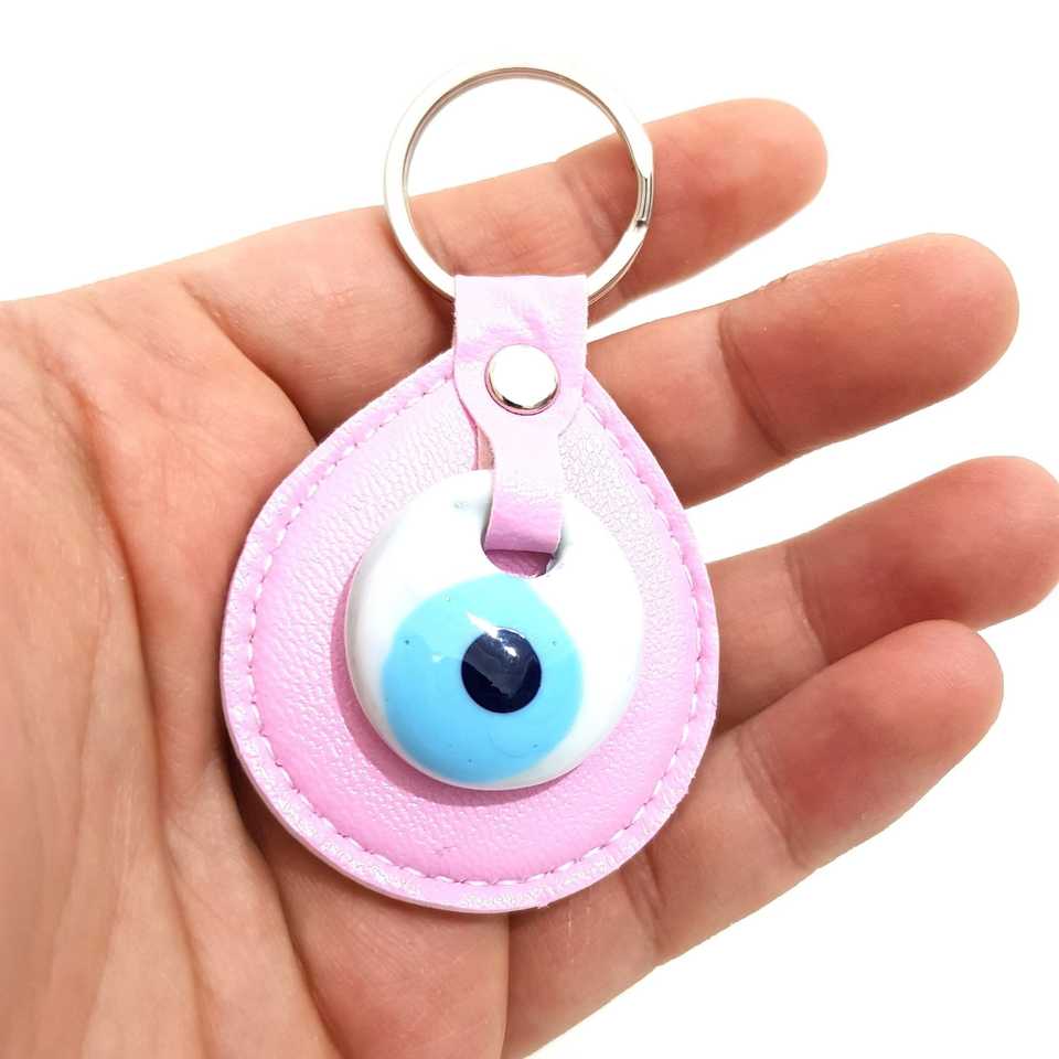 Llavero de cuero Nazar Boncuklu Yağmur Damlası Pembe-Beyaz Anahtarlık